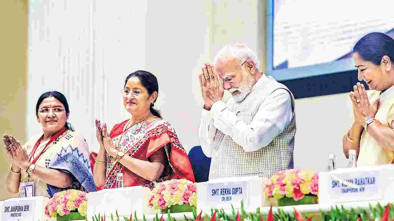 న్యూఢిల్లీ, ఏప్రిల్ 13 (ఆంధ్రజ్యోతి): మరో నాలుగు రోజుల్లో మహిళా రిజర్వేషన్, నియోజకవర్గాల పునర్విభజనపై పార్లమెంట్ ప్రత్యేక సమావేశాలు జరుగుతున్నాయి. ఈ నేపథ్యంలో దేశ రాజధానిలో ఈ అంశంపై వేడి రగులుకుంది. 21వ శతాబ్దిలో భారత్ తీసుకుంటున్న అతి పెద్ద నిర్ణయం మహిళలకు చట్టసభల్లో 33శాతం రిజర్వేషన్ కల్పించడం అని ఇప్పటికే ప్రధాని మోదీ అభివర్ణించారు. ఈ శతాబ్ది నారీ శక్తికి అంకితమని ప్రకటించారు. సోమవారం విజ్ఞాన్ భవన్లో 5వేల మంది మహిళల సమక్షంలో నిర్వహించిన ‘నారీ శక్తి వందన’ కార్యక్రమంలో ఆయన మాట్లాడుతూ, సామాజిక న్యాయం ఇక నినాదంగా కాక పని సంస్కృతిలో భాగం కాబోతోందని ప్రకటించారు. ‘నారీ శక్తి వందన చట్టం’ గురించి ఉధృతంగా గ్రామగ్రామాల్లో సోషల్ మీడియాలో ప్రచారం చేయాలని పిలుపునిచ్చారు. దేశవ్యాప్తంగా మహిళలతో సదస్సులు నిర్వహించాలని బీజేపీ తన పార్టీ విభాగాలను ఆదేశించింది. వివిధ రాష్ట్రాల నుంచి ముఖ్యమైన మహిళా నేతలందర్నీ ఢిల్లీకి పిలిపించిన బీజేపీ ఈ వారం రోజులూ ఢిల్లీలోనే ఉండి పెద్ద సంఖ్యలో కార్యక్రమాలు చేపట్టాలని వారికి నిర్దేశించింది. మహిళా రిజర్వేషన్ బిల్లుపై చర్చ జరిగే సమయంలో మహిళలు స్వయంగా పెద్ద ఎత్తున పార్లమెంటుకు వచ్చి తిలకించేందుకు బీజేపీ ఏర్పాట్లు చేసింది.