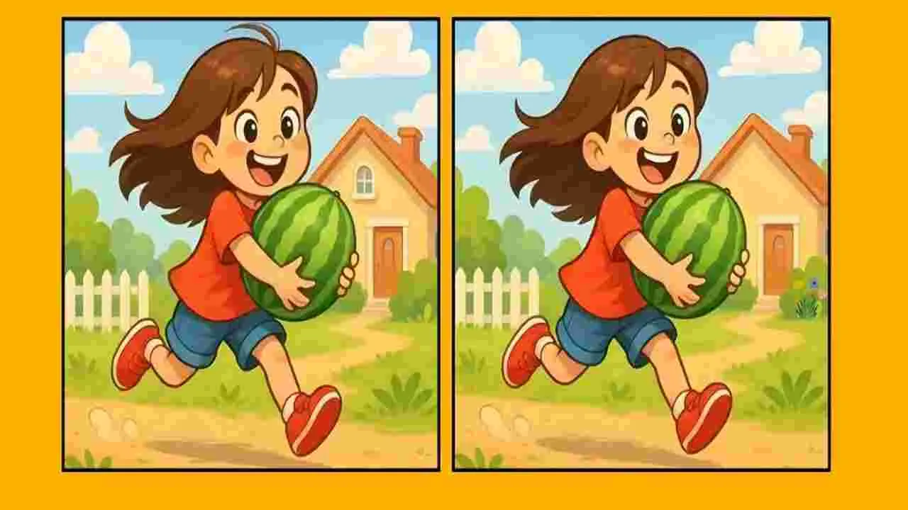 వైరల్ అవుతున్న ఆ ఫొటోలో ఒక బాలిక పుచ్చకాయను పట్టుకుని పరిగెడుతోంది. పక్క పక్కనే ఉన్న రెండు ఫొటోల్లోనూ అదే దృశ్యం ఉంది. అయితే ఆ రెండు ఫొటోల్లో మూడు చిన్న తేడాలున్నాయి. జాగ్రత్తగా గమనిస్తే ఆ రెండు ఫొటోల మధ్యనున్న తేడాలు కనబడతాయి. 25 సెకెన్ల వ్యవధిలో ఆ తేడాలను కనిపెడితే మీ బ్రెయిన్ స్పీడ్గా పని చేస్తున్నట్టు లెక్క. మీరు కనిపెట్టగలిగారా? అయితే కంగ్రాట్స్.. కనిపెట్టలేకపోయారా? అయితే కింది ఫొటో చూడండి.. తేడాలేంటో తెలుస్తుంది.
