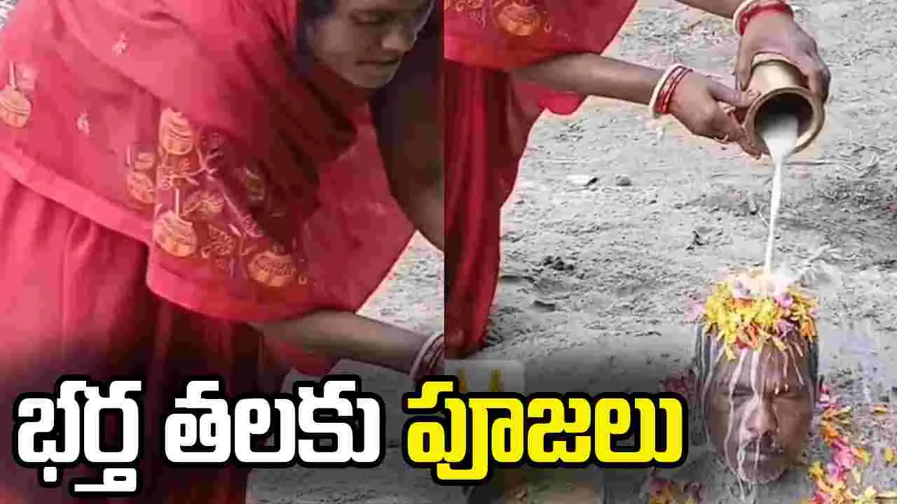 భర్తను ఇసుకలో పాతి పెట్టి.. తలకు పూజలు..