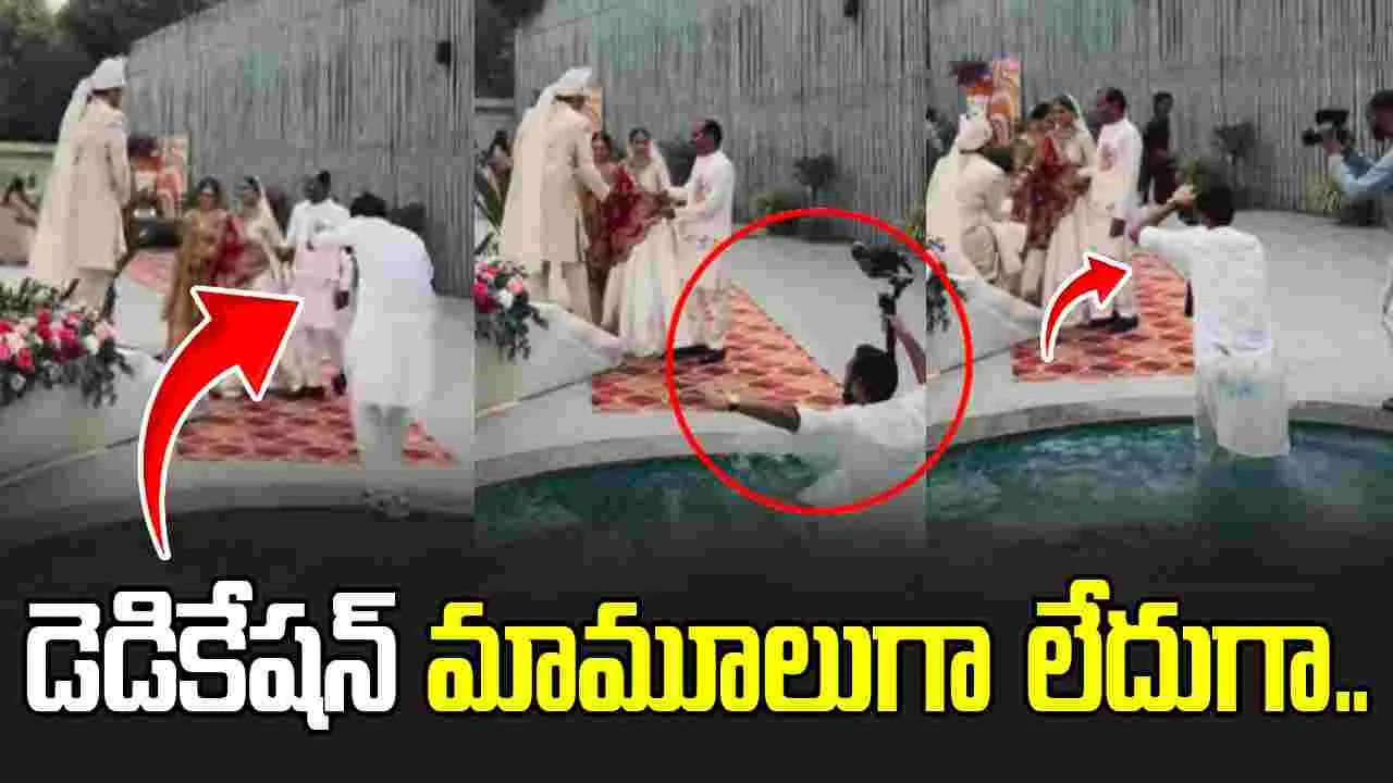 ఈ క్రమంలో వెనక చూసుకోకుండా పౌంటెన్ నీటిలో అడుగేశాడు. దీంతో కాలు జారి కెమెరా కొంచెం షేక్ అయింది. ఆ వెంటనే కిందపడకుండా నిలదొక్కుకుని, మళ్లీ యథాతథంగా వీడియో తీయడం స్టార్ట్ చేశాడు. వీడియోగ్రాఫర్ (Videographer) నీళ్లలో కాలు జారడం చూసి అక్కడున్న వారంతా ఉలిక్కిపడ్డారు. అయితే ఆ వెంటనే మళ్లీ నిలదొక్కుకుని వీడియో తీయడంతో హమ్మయ్య అని అనుకున్నారు. ఇలా ఆ వీడియోగ్రాఫర్ ఈ పెళ్లి వీడియోలను ఎంతో శ్రద్ధగా, అంకితభావంతో తీయడం అందరినీ ఆకట్టుకుంది.