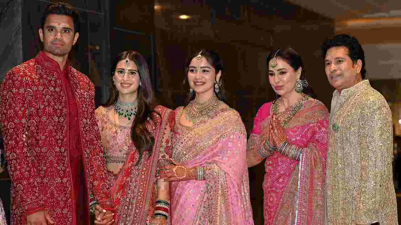 ముంబై: దిగ్గజ క్రికెటర్ సచిన్ టెండూల్కర్ కుమారుడు అర్జున్ టెండూల్కర్ వివాహం అంగరంగ వైభవంగా జరిగింది. గురువారం తన స్నేహితురాలు, ముంబైకి చెందిన ప్రముఖ వ్యాపారి రవి ఘాయ్ మనుమరాలు సానియా చందోక్ను అర్జున్ పెళ్లి చేసుకున్నాడు. ఈ కల్యాణానికి పలువురు రాజకీయ, క్రీడా, సినీ ప్రముఖులు విచ్చేసి వధూవరులను ఆశీర్వదించారు. ఐసీసీ చైర్మన్ జైషా, బీసీసీఐ ఉపాధ్యక్షుడు రాజీవ్ శుక్లా, ఆంధ్రప్రదేశ్ ఐటీ శాఖ మంత్రి నారా లోకేష్, వ్యాపారవేత్త ముఖే ష్ అంబానీ, నీతా అంబానీ, బాలీవుడ్ నటులు అమితాబ్-జయాబచ్చన్, అభిషేక్ బచ్చన్, ఐశ్వర్యరాయ్, షారుఖ్ ఖాన్, ఆమిర్ ఖాన్, టీమిండియా కోచ్ గౌతమ్ గంభీర్, మాజీ క్రికెటర్లు రాహుల్ ద్రవిడ్, అనిల్ కుంబ్లే, మహేంద్ర సింగ్ ధోనీ, యువరాజ్ సింగ్, హర్భజన్ సింగ్, వెంకటేష్ ప్రసాద్, హర్షా భోగ్లే, అజిత్ అగర్కార్, ప్రజ్ఞాన్ ఓఝా, మహ్మద్ కైఫ్, పియూష్ చావ్లా, యూసుఫ్, ఇర్ఫాన్ పఠాన్, చాముండేశ్వర్నాథ్ తదితరులు హాజరయ్యారు.