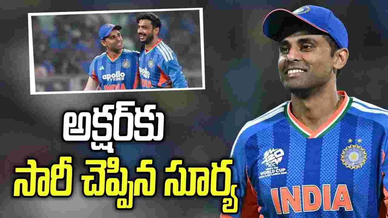 స్పోర్ట్స్ డెస్క్: స్వదేశంలో టీ20 ప్రపంచకప్(T20 World cup 2026) గెలిచిన తొలి జట్టుగా భారత్ నిలిచిన సంగతి తెలిసిందే. అలానే వరుసగా రెండోసారి, మొత్తంగా మూడోసారి పొట్టి ప్రపంచ కప్ను ముద్దాడిన ఏకైక జట్టుగా రికార్డు సృష్టించింది. ఇది ఇలాఉంటే తాజాగా టీ20 టీమిండియా వైస్ కెప్టెన్ అక్షర్ పటేల్కు కెప్టెన్ సూర్య కుమార్ యాదవ్ క్షమాపణలు చెప్పాడు. మరి.. అక్షర్కు సూర్య ఎందుకు సారీ చెప్పాడు?. ఆ వివరాలు ఇప్పుడు తెలుసుకుందాం...