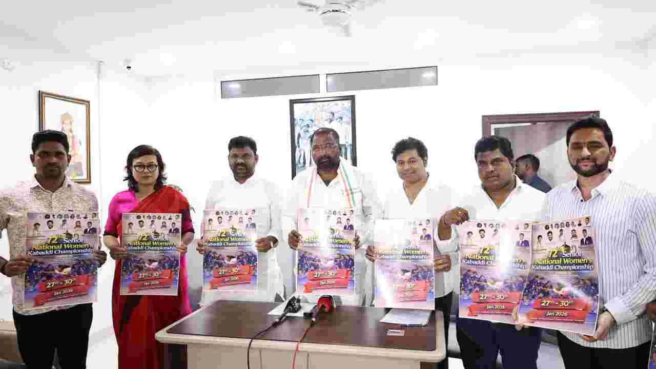 హైదరాబాద్లో శనివారం జాతీయ సీనియర్ మహిళల కబడ్డీ చాంపియన్షిప్ బ్రోచర్ను ఆవిష్కరిస్తున్న క్రీడామంత్రి వాకిటి శ్రీహరి...