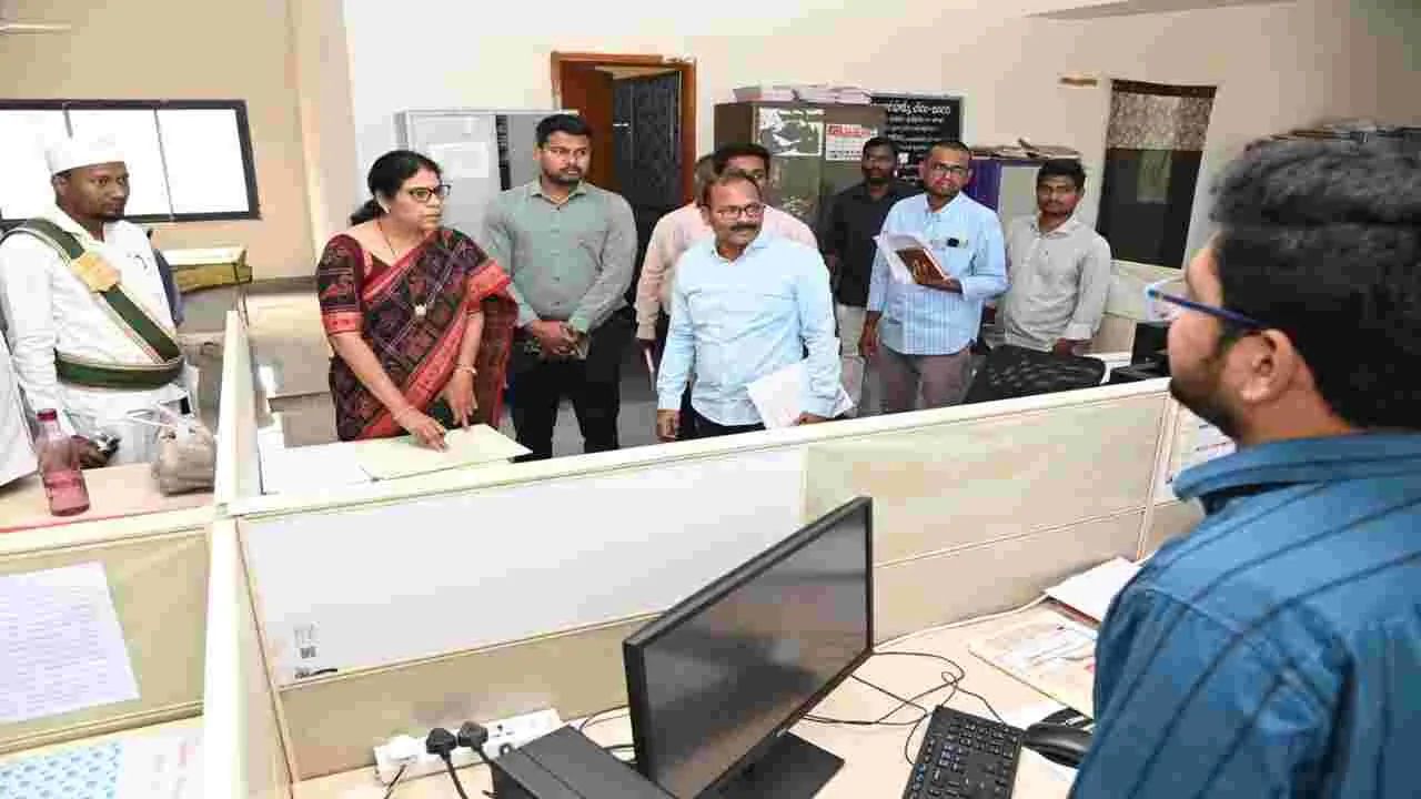 కాగా కలెక్టర్ ఆకస్మికంగా తనిఖీ చేసిన సమయంలో ల్యాండ్ అండ్ సర్వే డిపార్టుమెం ట్లో ఫీల్డ్ చైర్మన్గా విధులు నిర్వహిస్తున్న రాకేష్ అనే ఉద్యోగి తన స్థానంలో ప్రైవేటు వ్యక్తిని నియమించి తన విఽధులను చేయించడం కలెక్టర్ సాక్షిగా బట్టబయలైంది.