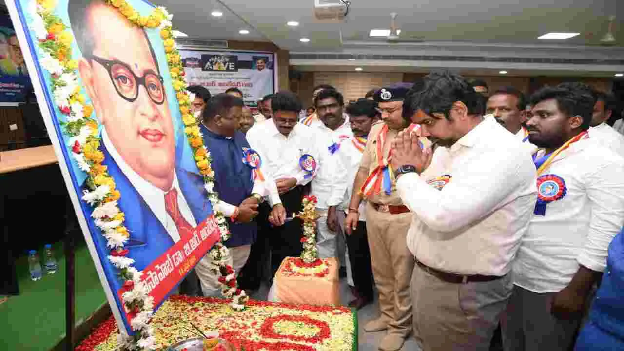 మంచిర్యాల కలెక్టరేట్, ఏప్రిల్ 14 (ఆంధ్రజ్యోతి) : సమానత్వ సమాజం కోసం కృషి చేసిన మహానీయుడు డాక్టర్ బీఆర్ అంబేద్కర్ అని జిల్లా కలెక్టర్ కుమార్ దీపక్ పేర్కొన్నారు. బీఆర్ అంబేద్కర్ 175వ జయంతిని పురస్కరించుకుని జిల్లా కేంద్రంలోని ఐబీ చౌరస్తాలోని అంబేద్కర్ విగ్రహా నికి పూలమాలలు వేసి నివాళులర్పించారు. అనంతరం సమీకృత కలెక్టరేట్ భవనంలో అంబేద్కర్ చిత్రపటానికి పూలమాలలు వేసి నివాళులర్పించారు. కేక్ కట్ చేశారు. ఈ సందర్భంగా కలెక్టర్ మాట్లాడుతూ దళిత, బడుగు, బలహీన వర్గాల ఆశాజ్యోతి డాక్టర్ అంబేద్కర్ అని ఆయన దేశానికి అం దించిన సేవలు చిరస్మరణీయమన్నారు. ఆనాటి సమాజంలోని అసమాన తలను ఎదుర్కొని ఉన్నత విద్యను అభ్యసించి సమాన అవకాశాల కోసం రాజ్యాంగాన్ని రచించారని తెలిపారు. అనంతంర తెలంగాణ సంస్కృతి సా రధి కళాకారులు అంబేద్కర్పై మామిళ్ల లచ్చన్న ఆలపించిన గీతాన్ని ఆవిష్కరించారు. విద్యార్థులు చేసిన సాంస్కృతిక కార్యక్రమాలు ఆకట్టుకు న్నాయి. ఈ కార్యక్రమంలో డీసీపీ భాస్కర్, అదనపు కలెక్టర్లు చంద్రయ్య, శ్రీనివాసరావు, అధికారులు దుర్గా ప్రసాద్, కిషన్, ఆయా సంఘాల నాయకులు పాల్గొన్నారు.