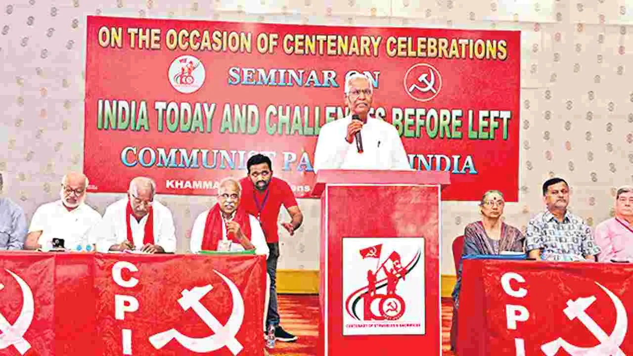 ఖమ్మం, జనవరి 20 (ఆంధ్రజ్యోతి): దేశంలో కమ్యూనిస్టు పార్టీల ఆవశ్యకతను ప్రజలకు తెలియజేయడంతో పాటు.. మతోన్మాద దోపిడీ విధానాలకు వ్యతిరేకంగా ప్రజాసమస్యలపైనా ప్రజాస్వామ్య హక్కులను పరిరక్షించుకునేందుకు కమ్యూనిస్టు పార్టీల ఆధ్వర్యంలో సర్వజనులను సమాయత్తం చేసి ఐక్యపోరాటాలకు సిద్ధం చేయాలని నాలుగు కమ్యూనిస్టు పార్టీల జాతీయ నాయకులు పిలుపునిచ్చారు. ఎదురవుతున్న సవాళ్లను పరిగణనలోకి తీసుకుని కేంద్రంలో మోదీ ప్రభుత్వం అనుసరిస్తున్న విధానాలకు వ్యతిరేఖంగా భవిష్యత్తు ఉద్యమాలను ముందుకు సాగిద్దామని నిర్ణయించారు. ఖమ్మంలో మంగళవారం సీపీఐ, సీపీఎం, సీపీఐ(ఎంఎల్)లిబరేషన్, ఆల్ ఇండియా ఫార్వర్డ్ బ్లాక్ నాలుగు కమ్యూనిస్టు పార్టీల ఆధ్వర్యంలో ‘నేటి భారత దేశం కమ్యునిస్టు పార్టీలు ఎదుర్కొంటున్న సవాళ్లు’ అనే అంశంపై నిర్వహించిన సెమినార్లో నాలుగు పార్టీల జాతీయ ప్రధాన కార్యదర్శులు డి.రాజా, ఎంఏ బేబి, దీపాంకర్ భట్టాచార్య, డి.దేవరాజన్ ప్రసంగించి.. కమ్యూనిస్టు పార్టీలకు దశాదిశను నిర్ధేశించారు. వామపక్షాల ఐక్య ఉద్యమాల ఆవశ్యకతను వివరించారు. సీపీఐ రాష్ట్ర కార్యదర్శి కూనంనేని సాంబశివరావు అధ్యక్షతన జరిగిన సమావేశంలో డి రాజా మాట్లాడుతూ దేశంలో వలస విధానాల వల్ల అనేక అసమానతలున్నాయన్నారు. ఆరెస్సెస్ ఈ దేశంలో స్వాతంత్య్రం కోసం కానీ, ప్రజాసంక్షేమం కోసం కానీ పనిచేయలేదని ప్రజల కోసం ఏమీ పనిచేయలేదని దేశంలో కార్మిక వర్గాన్ని వారి హక్కులను కాపాడుకోవడం కోసం వర్గదోపిడీ లేని సమాజాన్ని నిర్మించుకోవాలన్నారు. కేంద్రంలోని అధికారంలో ఉన్న మోదీ ప్రభుత్వం రాజ్యాంగ విలువలను తుంగలో తొక్కుతోందని సీపీఎం జాతీయ ప్రధాన కార్యదర్శి ఎంఏ బేబీ ఆరోపించారు. సీపీఐ(ఎంల్) జాతీయ ప్రధాన కార్యదర్శి దీపాంకర్ భట్టాచార్య ప్రసంగిస్తూ సీపీఐ వందేళ్ల ఉద్యమం ఒక చరిత్ర అని, ఖమ్మంలో ఘనంగా జరుపుకొన్న ముగింపు ఉత్సవాలతో కమ్యూనిస్టుల పట్ల ప్రజాకర్షణ కనిపిస్తోందన్నారు. తెలంగాణ విప్లవ పోరాటాల గడ్డ అని, తెలంగాణకు విప్లవ చరిత్రలో ప్రత్యేక స్థానం ఉందన్నారు. ఆల్ ఇండియా ఫార్వర్డ్ బ్లాక్ జాతీయ కార్యదర్శి డి దేవరాజన్ ప్రసంగిస్తూ కమ్యూనిస్టు పార్టీల్లో ఐక్యత పెంపొందించుకోవాలని, సిద్ధాంతపరమైన పద్ధతుల్లో పనిచేసే విధానంలో విప్లవాత్మక మార్పులు రావాల్సిన అవసరం ఉందన్నారు. సీపీఐ తెలంగాణ కార్యదర్శి కూనంనేని సాంబశివరావు మాట్లాడుతూ ఈసెమినార్ లక్ష్యాన్ని వివరించారు. నాలుగు ప్రధాన కమ్యూనిస్టు పార్టీలు నేతలు ఒకే వేదికపై నిలిచి ఐక్యతాభావాన్ని చాటి చెప్పడం గర్వించదగిన విషయమన్నారు. ఈ సెమినార్లో ఏఐటీయూసీ జాతీయ ప్రధాన కార్యదర్శి అమర్జిత్కౌర్, సీపీఐ జాతీయ నాయకులు రామకృష్ణపాండే, గిరిజాశర్మ, ప