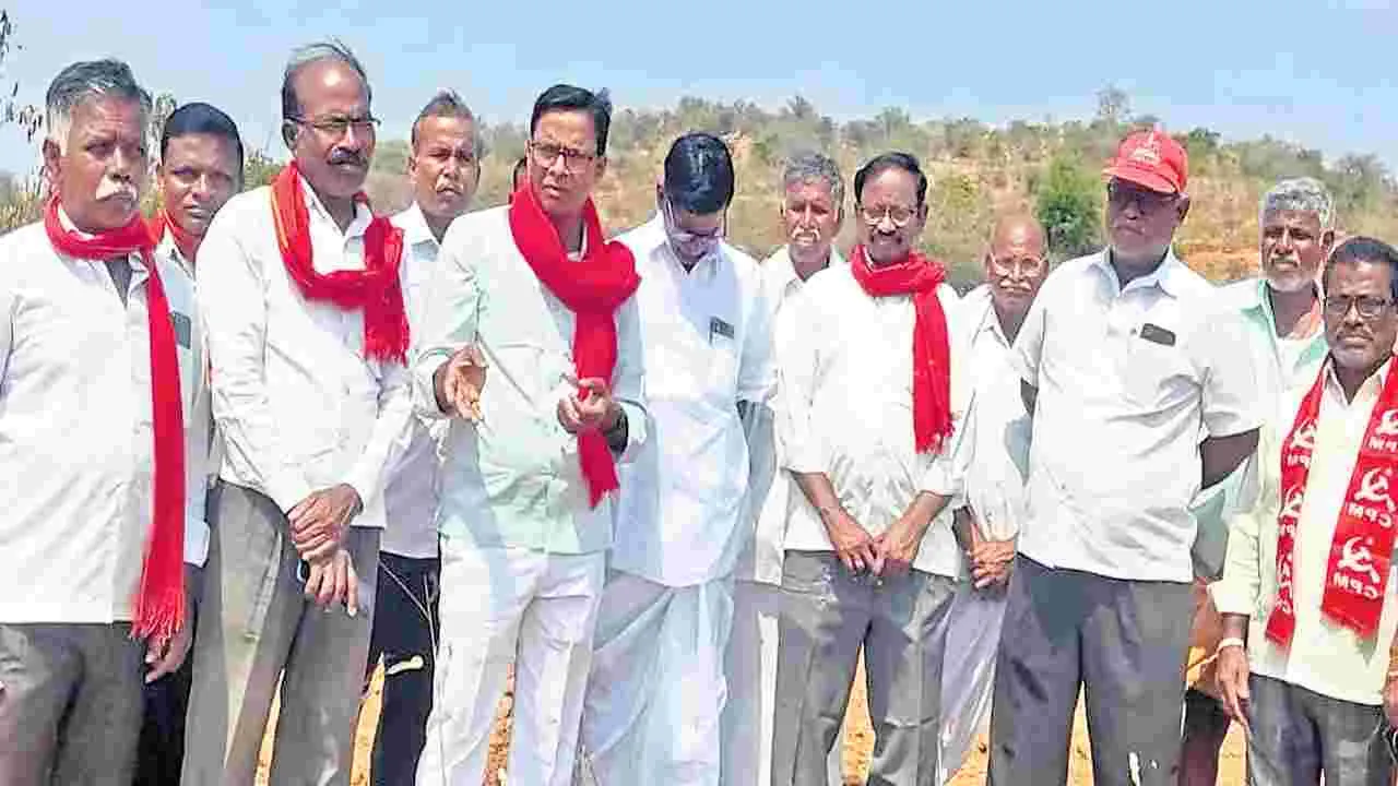 సంస్థాన్నారాయణపురం, ఏప్రిల్ 6 (ఆంధ్రజ్యోతి): పేదలు సాగు చేసుకుంటున్న భూములకు ప్రభుత్వం వెంటనే పట్టాలు ఇవ్వాలని, లేదంటే ఉద్యమం ఉధృతం చేస్తామని సీపీఎం జిల్లా కార్యదర్శి ఎండీ జహంగీర్ డిమాండ్ చేశారు. మండలకేంద్రంలోని సర్వే 225లోని ప్రభుత్వ భూమిని పోలీస్ బెటాలియన్ ఏర్పాటుకు ప్రతిపాదించడతోఓ పార్టీ నాయకులతో కలిసి ఆ భూమిని సోమవారం పరిశీలించారు. భూ ములు సాగు చేసుకుంటున్న రైతులతో మాట్లాడి వారి సమస్యలు అడిగి తెలుసుకున్నారు. పేద రైతులు సాగు చేసుకుంటున్న భూమిలో ప్రభుత్వం పోలీస్ బెటాలియన్ ఏర్పాటు చేయాలన్న ప్రతిపాదనను తక్షణమే ఉపసంహరించుకోవాలని కోరారు. 150 ఎకరాల భూమిని ఎంతో మంది రైతులు సాగు చేసుకుంటున్నారని, ప్రభుత్వ ప్రతిపాదనతో పేద రైతులకు తీవ్ర నష్టం వాటిల్లుతుందన్నారు. రైతుల ఇబ్బందులు దృష్టిలో ఉంచుకొని ప్రభుత్వం తన ప్రతిపాదనను విరమించుకోవాలని కోరారు. ఎన్నికల ముందు ప్రభుత్వం ఇచ్చిన హామీలను తక్షణమే అమలు చేయాలని డిమాండ్ చేశారు. ఈ కార్యక్రమంలో సీపీఎం జిల్లా కార్యదర్శివర్గ సభ్యులు గుంటోజు శ్రీనివాసచారి, మండల కార్యదర్శి దోడ యాదిరెడ్డి, నాయకులు తుమ్మల నర్సిరెడ్డి, పెద్దులు, ముత్యాలు, అంజయ్య, చింతకాయల నర్సింహ, రాచకొండ కృష్ణ, శంకరయ్య, కొమ్ము మల్లేశం పాల్గొన్నారు.