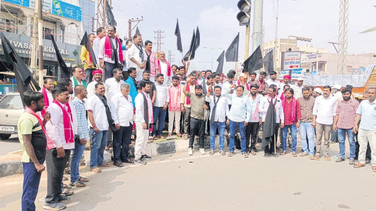 ఫ కల్వకుర్తి పట్టణంలో మాజీ ఎమ్మెల్యే గుర్క జైపాల్ యాద వ్, మాజీ మునిసిపల్ చైర్మన్ ఎడ్మ సత్యం ఆధ్వర్యంలో ఆదివారం బీఆర్ఎస్ శ్రేణులు నల్ల బ్యాడ్జీలు, నల్ల కండువాలు ధరించి బారీ ఎత్తున నిరసన ర్యాలీ నిర్వహించారు. స్థానిక అంబేడ్కర్ విగ్రహా నికి వారు పూలమాల వేసి నివాళులు అర్పించారు. తెలంగాణ ప్ర భుత్వానికి వ్యతిరేకంగా పెద్ద ఎత్తున నినాదాలు చేశారు. కార్యక్ర మంలో బీఆర్ఎస్ పట్టణ అధ్యక్షుడు భావండ్ల మధు, మాజీ ఎంపీ పీ కొండూరు గోవర్ధన్, బీఆర్ఎస్ నాయకులు పాల్గొన్నారు. ఫ కొ ల్లాపూర్లో మాజీ ఎమ్మెల్యే బీరం హర్షవర్ధన్రెడ్డి ఆధ్వర్యంలో బీ ఆర్ఎస్ నాయకులు, కార్యకర్తలు భారీ ర్యాలీ నిర్వహించారు. స్థాని క బస్టాండ్ సెంటర్లో ప్రభుత్వానికి వ్యతిరేకంగా నినాదాలు చేసూ త సీఎం రేవంత్రెడ్డి దిష్టిబొమ్మను దహనం చేశారు. రాస్తారోకో చేశారు. బీఆర్ఎస్ పార్టీ మునిసిపల్ మాజీ కౌన్సిలర్లు, నాయకులు, కార్యకర్తలు పాల్గొన్నారు. ఫ పెంట్లవెల్లితో పాటు జటప్రోలు, మల్లేశ్వరం తదితర గ్రా మాలలో మాజీ సర్పంచు రాజేశ్, బీఆర్ఎస్ మండల అధ్యక్షుడు పోతుల వెంకటేశ్వర్లు ఆధ్వర్యంలో సీఎం రేవం త్రెడ్డి దిష్టిబొమ్మ దహనం చేశారు. ఫ తాడూరుతో పాటు గ్రామా ల్లో సీఎం దిష్టిబొమ్మను దహనం చేశారు. ఫ తెలకపల్లిలోని వివే కానంద చౌరస్తాలో గ్రంథాలయం మాజీ చైర్మన్ హనుమంతు రావు, నాయకుడు శ్రీనివాస్ ఆధ్వర్యంలో సీఎం దిష్టిబొమ్మను దహనం చేశారు. ర్యాలీ నిర్వహించారు. ఫ అచ్చంపేట పట్టణంతో పాటు మండలంలోని అంకిరోనిపల్లి గ్రామంలో బీఆర్ఎస్ నా యకులు ఆందోళనలు నిర్వహించారు. సీఎం దిష్టిబొమ్మ దహనం చేశారు. బీఆర్ఎస్ నాయకులు సతీష్, బాలు, నరేష్ ఉన్నారు. ఫ ఉప్పునుంతలలో బీఆర్ఎస్ మండల అధ్యక్షుడు కొత్త రవీందర్రావు ఆధ్వర్యంలో బీఆర్ఎస్ ఆధ్వర్యంలో నిరసన కార్యక్రమం నిర్వహిం చారు. నాయకులు గోపాల్రెడ్డి, సర్పంచ్ మున్యానాయక్, నాయకు లు ఉన్నారు. ఫ వెల్దండలో బీఆర్ఎస్ రాష్ట్ర నాయకుడు జూపల్లి భాస్కర్రావు ఆధ్వర్యంలో నాయకులు, కార్యకర్తలు నల్ల బ్యాడ్జీలు ధరించి రాస్తారోకో నిర్వహించారు. మాజీ ఎంపీపీ రాంరెడ్డి, వెంకట య్యగౌడ్, సర్పంచ్ కొండల్ యాదవ్, నాయకులు పాల్గొన్నారు. ఫ వంగూరులో మాజీ మునిసిపల్ చైర్మన్ నర్సింహ్మగౌడ్, బీఆర్ఎస్ మాజీ మండల అధ్యక్షుడు కోట్ల నరేందర్రావు ఆధ్వర్యంలో బ్యాంక్ చౌరస్తాలో నోటికి నల్లగుడ్డలు కట్టుకొని నిరసన వ్యక్తం చేశారు. ఫ చారకొండలో చారకొండ సర్పంచ్, బీఆర్ఎస్ నాయకుడు గుండె విజేందర్గౌడ్, ఉప సర్పంచ్ కీసరి మల్లేష్, పట్టణ అధ్యక్షుడు సవారి శ్రీనివాసులుగౌడ్, బీఆర్ఎస్ మండల ఇన్చార్జి బొడ్డు శ్రీశైలం ఆధ్వర్యంలో అంబేడ్కర్ చౌరస్తాలో నిరసన వ్యక్తం చేశారు. ఫ ఊర్కొండలోని కల్వకుర్తి-జడ్చర్ల ప్రదాన రహదారి