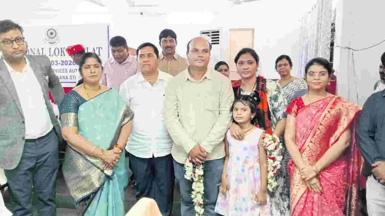 జగిత్యాల టౌన్, మార్చి 28 (ఆంధ్రజ్యోతి): రాజీ మార్గమే రాజ మార్గమని జిల్లా ప్రధాన న్యాయమూర్తి రత్న పద్మావతి పేర్కొన్నారు. కేసుల పేరుతో యేళ్ల తరబడి కోర్టుల చుట్టూ తిరిగి సమయాన్ని వృథా చేసుకోకుండా రాజీ ద్వారా కేసులు పరిష్కరించుకోవాలని సూచించారు. జిల్లా కోర్టులో శనివారం జాతీయ మెగా లోక్ అదాలత్ నిర్వహించారు. ఈ సందర్బంగా జిల్లా ప్రధాన న్యాయమూర్తి రత్న పద్మావతి మాట్లాడుతూ జాతీయ మెగా లోక్ అదాలత్లో సమిష్టి కృషితో 3034 కేసులు పరిష్కారం అయినట్లు తెలిపారు. ఇందులో సివిల్ 37, క్రిమినల్ 2473, ఫ్రీ లిటిగేషన్ కేసులు 524 పరిష్కారం అయ్యాయన్నారు. 10 మోటర్ యాక్ట్ సంబంధించిన కేసులు పరిష్కారం కాగా వాటికి సంబంధించి రూ.69,05,000 నష్ట పరిహారం చెల్లించినట్లు తెలిపారు. ముగ్గురు దంపతులకు సంబంధించిన కేసులలో రాజీ కుదరగా న్యాయమూర్తుల సమక్షంలో వారు మళ్లీ పూల దండలు మార్చుకొని ఏకమయ్యారు. ఈ సందర్భంగా వివిధ కారణాలతో తల్లిని కోల్పోయి, కొందరు తండ్రిని కోల్పోయి అనాఽఽథలుగా మారిన ముగ్గురు బాలికలను జిల్లా బాలల సంరక్షణ విభాగ్ మిషన్ వాత్సల్యలో భాగంగా వారికి పునరావాస చర్యలు చేపట్టి పలు కస్తూర్బా పాఠశాలల్లో చేర్పించినట్లు తెలిపారు. కార్యక్ర మంలో జిల్లా మొదటి అదనపు జడ్జి నారాయణ, జిల్లా న్యాయ సేవా సంస్థ కార్యదర్శి, సబ్ జడ్జి వెంకట మల్లిక్ సుబ్రమణ్య శర్మ, ప్రిన్సిపల్ జూని యర్ సివిల్ జడ్జి లావణ్య, మొదటి అదనపు జూనియర్ సివిల్ జడ్జి శ్రీనిజ, రెండవ అదనపు జూనియర్ సివిల్ జడ్జి నిఖిష, బార్ అసోసి యేషన్ అధ్యక్ష, కార్యదర్శులు శ్రీరాములు, న్యాయవాదులు, అధికారులు పాల్గొన్నారు.
