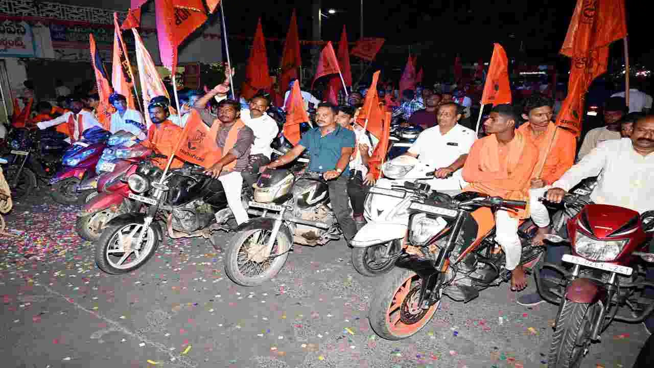 కరీంనగర్ కల్చరల్, ఏప్రిల్ 2 (ఆంధ్రజ్యోతి): హిందువులంతా ఐక్యంగా ఉండాలని తెలంగాణ ధర్మాచార్య పీఠం సర్వేశ్వరాంబిక శివయోగి శివాచార్య స్వామి అన్నారు. హనుమాన్ చిన్న జయంతి సందర్భంగా విశ్వహిందూపరిషత్, భజరంగదళ్ ఆధ్వర్యంలో వీరహనుమాన్ విజయయాత్ర పేరుతో భారీ బైక్ ర్యాలీని గురువారం నిర్వహించారు. గాంధీరోడ్ రామాలయం వద్ద ర్యాలీ ప్రారంభంలో స్వామీజీ మాట్లాడుతూ ప్రతి ఒక్కరూ హిందూ ధర్మం కోసం ఏకీకృతం కావాలని అన్నారు. కుటుంబ, సామాజిక ధర్మాన్ని హిందువులు పాటిస్తారని, మన దేశం, సంస్కృతీ సాంప్రదాయలకోసం పాటుపడాలని పిలుపునిచ్చారు. కరీంనగర్ కరినగరమని, ఒకప్పుడు ఏనుగులతో విలసిల్లేదని, ఏనుగు అంటే వినాయకుడు ఆయన జ్ఞానానికి ప్రతీక అని తెలిపారు. కాషాయ ధ్వజం రెపరెపలాడే చోట ముక్కోటి దేవతలు కొలువై ఉంటారని అన్నారు. యాత్ర టవర్సర్కిల్, ప్రకాశం గంజ్, రూరల్ పోలీస్ స్టేషన్, కమాన్, వన్టౌన్ పోలీస్స్టేషన్, బస్టాండ్, తెలంగాణచౌక్, ఆర్అండ్బీ గెస్ట్హౌస్, కోర్ట్, మంచిర్యాల, గాంధీరోడ్ చౌరస్తాల మీదుగా ర్యాలీ తిరిగి గాంధీరోడ్ రామాలయం వద్దకు చేరుకుంది. కార్యక్రమంలో వీహెచ్పీ జిల్లా అఽధ్యక్ష, కార్యదర్శులు ఇనుగంటి మధుసూదన్రావు, ఆదిమూలం విద్యాసాగర్, భజరంగదళ్ జిల్లా జోనల్ కన్వీనర్ తోట ప్రదీప్కుమార్, జిల్లా కన్వీనర్ కన్నం శంకర్, తోట రాజేందర్, గుజ్జేటి రాజేందర్, మహేశ్, వంశీ, అఖిల్, శివసాయి, గౌతమ్, శివ, అశోక్, శ్రీనివాస్, సంతోష్, రంజిత్, నందకిషోర్ పాల్గొన్నారు.