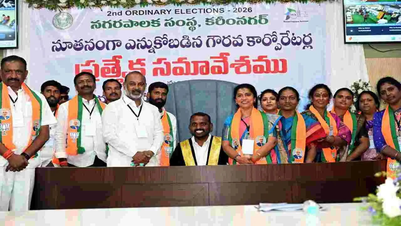 కరీంనగర్ టౌన్, ఫిబ్రవరి 16 (ఆంధ్రజ్యోతి): రెండురోజుల క్రితం జరిగిన కార్పొరేషన్ ఎన్నికల్లో గెలుపొందిన కార్పొరేటర్ల ప్రమాణ స్వీకారోత్సవం సోమవారం ప్రశాంతంగా జరిగింది. మున్సిపల్ సమావేశ మందిరంలో కమిషనర్ ప్రపుల్దేశాయ్ ఆధ్వర్యంలో 66వ డివిజన్లలో గెలుపొందిన 66 మంది కార్పొరేటర్లతో ఆథరైజ్డ్ ఆఫీసర్, ఆర్డీవో మహేశ్వర్ ప్రమాణ స్వీకారం చేయించారు. ఎన్నికల పరిశీలకులు జితేందర్రెడ్డి, మనోహర్ సమక్షంలో జరిగిన ఈ కార్యక్రమానికి కలెక్టర్, కార్పొరేషన్ ప్రత్యేకాధికారి పమేలాసత్పతి హాజరయ్యారు. ఉదయం 11.30 నుంచి అక్షర క్రమంలో కాంగ్రెస్, బీజేపీ, బీఆర్ఎస్, ఎంఐఎం, ఇండిపెండెంట్, ఫార్వర్డ్బ్లాక్కు చెందిన సభ్యులతో ప్రమాణస్వీకారం చేయించారు.అనంతరం నిర్వహించిన మేయర్, డిప్యూటీ మేయర్ ఎన్నిక ప్రక్రియకు కేంద్రహోంశాఖ సహాయమంత్రి, ఎంపీ బండి సంజయ్కుమార్ ఎక్స్ ఆఫీషియో సభ్యుడిగా హాజరై తమ ఓటు హక్కును వినియోగించుకున్నారు. భారతీయ జనతా పార్టీ (బీజేపీ) నుంచి మేయర్ అభ్యర్థిగా కొలగాని శ్రీనివాస్, డిప్యూటీ మేయర్ అభ్యర్థిగా యాదగిరి సునీల్రావుకు బీ-ఫారం అందించి పోటీలో ఉంచారు. కాంగ్రెస్ నుంచి మేయర్ అభ్యర్థిగా ఆకుల నర్మద, డిప్యూటీ మేయర్ అభ్యర్థిగా హీనా ఆఫ్రీన్ బరిలో నిలిచారు. రాష్ట్ర ఎన్నికల కమిషన్ నిబంధనల మేరకు అక్షరమాల ఆర్డర్లో మేయర్, డిప్యూటీ మేయర్ అభ్యర్థుల ఎన్నిక ప్రక్రియ నిర్వహించారు.
