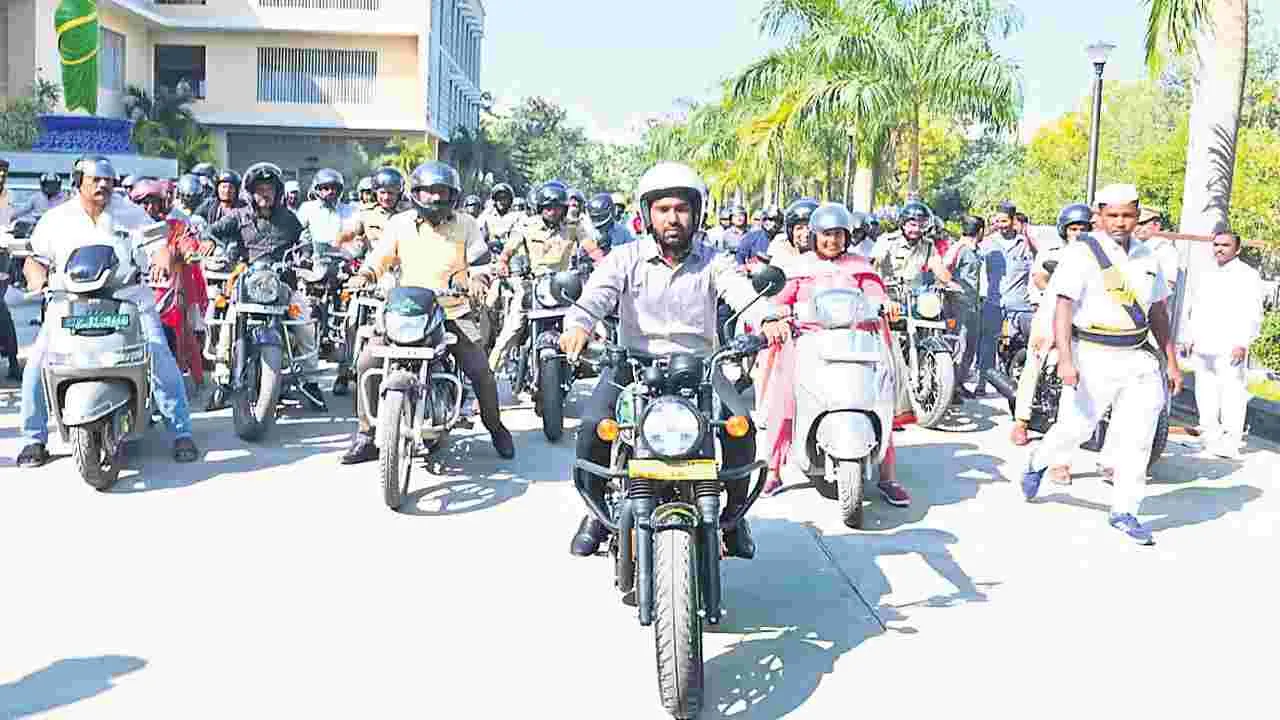 జగిత్యాల, జనవరి 8 (ఆంధ్రజ్యోతి): వాహనదారులు డ్డు భద్రత నియమాలు పాటించాలని కలెక్టర్ సత్యప్రసాద్ అన్నారు. గురువారం జిల్లా కేంద్రంలోని సమీకృత కలెక్టరేట్లో జాతీయ రోడ్డు భద్రత మాసోత్సవం-2026 సందర్భంగా అవగాహన కార్యక్రమాన్ని నిర్వహిం చారు. కలెక్టరేట్ నుంచి కొత్త బస్టాండ్ వరకు బైక్ ర్యాలీ నిర్వహించారు. హెల్మెట్ ధరించండి.. ప్రాణాలు కాపాడుకోండి... అనే నినాదాలతో ర్యాలీ నిర్వహించారు. ఈ సందర్భంగా కలెక్టర్ సత్యప్రసాద్ మాట్లాడుతూ రోడ్డు ప్రమాదాలు తగ్గించడమే లక్ష్యమని తెలిపారు. ప్రతి వాహనదారుడు ట్రాఫిక్ నిబంధనలు తప్పని సరిగా పాటించాలని సూచించారు. ద్విచక్ర వాహనదారులు హెల్మెట్ ధరించాల్సిన అవసరం ఉందన్నారు. మద్యం సేవించి వాహనం నడపరాదని హెచ్చరించారు. అధిక వేగం ప్రమా దాలకు ప్రధాన కారణమని తెలిపారు. లైసెన్స్ లేకుండా వాహనం నడప కూడదన్నారు. వాహన పత్రాలు సక్రమంగా ఉంచుకోవాలని సూచించారు. రోడ్ సేఫ్టీ ప్రతి ఒక్కరి బాధ్యత అన్నారు. పలు ప్రభుత్వ శాఖలకు చెందిన అధికారులు, ఉద్యోగులు, ప్రజలు పెద్ద ఎత్తున ఉత్సాహంగా పాల్గొన్నారు. ఈ కార్యక్రమంలో జిల్లా అదనపు కలెక్టర్ బీఎస్ లత, జిల్లా ఆర్టీఏ మెంబర్ కంటాల శ్రీనివాస్, రవాణా శాఖ, పోలీస్, కలెక్టరేట్ సిబ్బంది, వివిధ స్థాయిల అధికారులు, ప్రజలు పాల్గొన్నారు.