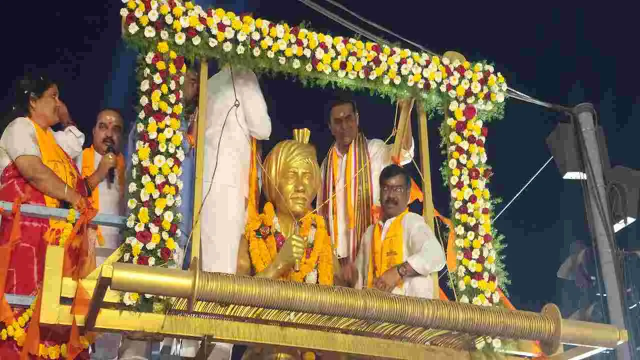 విఠల... విఠల.. పాండురంగా.. అంటూ శివభక్త మార్కండేయ స్వామి నామస్మరణతో స్వామివారి శోభాయాత్ర కనుల పండుగగా సాగింది. పద్మశాలి సంఘం ఆధ్వర్యంలో శ్రీశివభక్త మార్కండేయ స్వామి జయంతి ఉత్స వాలు ఘనంగా నిర్వహించారు. బుధవారం రాజన్న సిరిసిల్ల జిల్లా కేంద్రంలోని మార్కండేయ స్వామి దేవస్థానంలో స్వామివారి మహాయజ్ఞం నిర్వహించారు. సాయంత్రం పద్మశాలీలు, మహిళలు, విద్యార్థుల కోలాట నృత్యాలు జనసందోహాం మధ్య వైభవోపేతంగా మార్కండేయ స్వామి శోభాయాత్ర నిర్వహించారు. ప్రత్యేక వాహనంపై మార్కండేయ స్వామి ఉత్సవ విగ్రహంతో మార్కండేయ దేవస్థానం నుంచి బయలుదేరిన యా త్ర గాంధీచౌక్, అంబేద్కర్ చౌరస్తా, చేనేత చౌక్, పెద్దబజార్ మీదుగా వెంకటేశ్వర స్వామి దేవాలయం మీదుగా కొనసాగింది. శోభాయాత్రకు వేలాదిగా తరలివచ్చిన పద్మశాలీలు, మార్కండేయ స్వామి భక్తులు అడు గడుగునా నృత్యాలు చేస్తూ మార్కండేయ నామ స్మరణ చేశారు. విద్యా ర్థులు కోలాటం, నృత్యాలు చేశారు. శోభాయాత్రలో పద్మబ్రాహ్మణులు ప్రత్యేక పూజలు నిర్వహించారు. శోభాయాత్రలో గాంధీ, అంబేద్కర్, నేత న్న విగ్రహాలకు పూలమాలలు వేశారు. జయంతి ఉత్సవాల్లో బీఆర్ఎస్ అధ్యక్షుడు, మాజీ మంత్రి కే తారకరామారావు, ప్రభుత్వ విప్ ఆది శ్రీని వాస్లు ప్రత్యేక పూజలు చేశారు. ఈ కార్యక్రమంలో పద్మశాలి సంఘం అధ్యక్షుడు దూడం శంకర్, టెస్కాబ్ మాజీ చైర్మన్ కొండూరు రవీందర్ రావు, పవర్లూం టెక్స్టైల్ కార్పొరేషన్ మాజీ చైర్మన్ గూడూరి ప్రవీణ్, సిరిసిల్ల మున్సిపల్ మాజీ చైర్పర్సన్ జిందం కళచక్రపాణి, అర్బన్ బ్యాంక్ చైర్మన్ రాపెల్లి లక్ష్మీనారాయణ, పద్మశాలి సంఘం ప్రధాన కార్యదర్శి మండల సత్యం, ఉపాధ్యక్షులు మోర రవి, గాజుల బాలయ్య, కోశాధి కారి యెల్లే శ్రీనివాస్, మున్సిపల్ మాజీ చైర్మన్ అడెపు రవీందర్, బీఆర్ఎస్ పట్టణ అధ్యక్షుడు జిందం చక్రపాణి, కాంగ్రెస్ జిల్లా అధ్య క్షుడు సంగీతం శ్రీనివాస్, బీఆర్ఎస్ జిల్లా ఆధ్యక్షుడు తోట ఆగయ్య, టౌన్ క్లబ్ ఆధ్యక్షుడు చొప్పదండి ప్రకాష్, పద్మశాలి సంఘం ప్రతిని ధులు బొల్లి రామ్మోహన్, మ్యాన రవి, యెల్లే లక్ష్మీనారాయణ, పూర్లచం దర్, వస్త్రోత్పత్తిదారుల సంఘం అధ్యక్షుడు అడేపు భాస్కర్, కార్యదర్శి రవి, చేనేత వస్త్ర వ్యాపార సంఘం అధ్యక్షుడు తాటిపాముల దామోదర్, పద్మశాలి మహిళ సంఘం అధ్యక్షురాలు కాముని వనిత, గుజ్జెతార, దార్నం అరుణ, పత్తిపాక పద్మ, మాజీ అధ్యక్షుడు గోలి వెంకటరమణ వస్త్ర పరిశ్రమ అనుబంధ సంఘాల ప్రతినిధులు, మున్సిపల్ కౌన్సిల ర్లు, ప్రజాప్రతినిధులు పాల్గొన్నారు.