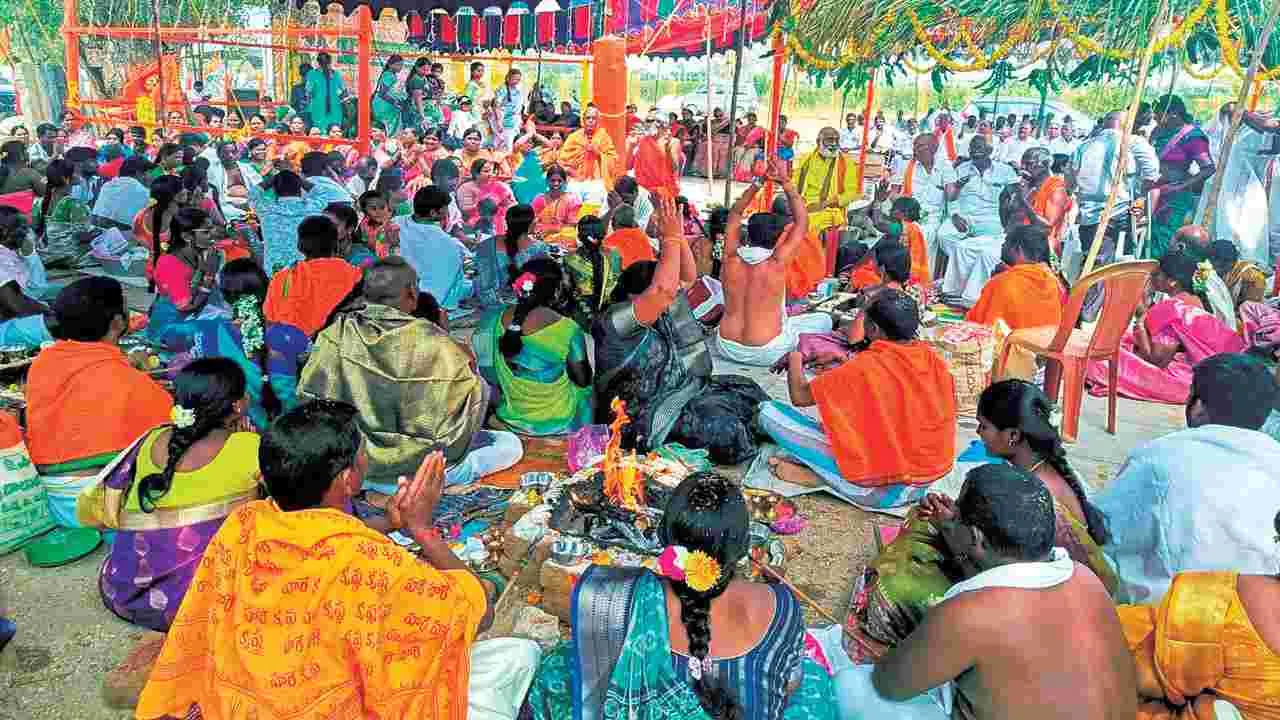 - మొదటి రోజు ఆలయ ప్రాంగణంలో భక్తిశ్రద్ధలతో నిర్వహించిన విశ్వశాంతి మహాయజ్ఞం