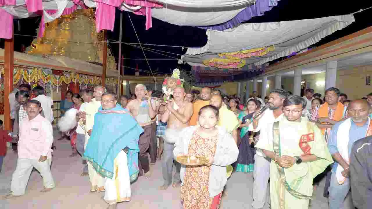 ఊర్కొండ, జనవరి 18 (ఆంధ్రజ్యోతి): నాగర్కర్నూల్ జిల్లా ఊర్కొండ మండలం ఊర్కొండపేటలో వెలసిన అభయాంజనే యుడు ఆదివారం గజవాహనంపై ఊరేగా రు. స్వామి వారి బ్రహ్మోత్సవాల సందర్భం గా భక్తులు పోటెత్తారు. ఆలయ పరిసరా లు హనుమాన్ నామస్మరణతో మారుమో గాయి. ఆదివారం సెలవు రోజు కావడంతో భక్తులు అధిక సంఖ్యలో తరలి వచ్చి స్వా మి వారికి ప్రత్యేక పూజలు, వ్రతాలు చేశా రు. అభయాంజనేయస్వామి వారి బ్రహ్మో త్సవాలను పురస్కరించుకొని రెండో రోజు స్వామి వారికి ఉదయం అర్చకులు పంచ సూక్తములతో పూజలు, సహస్రనామార్చన, గణపతి నవగ్రహ అష్టదిక్పాలక లక్ష్మీ అవ నం (హోమం) నిర్వహించారు. రాత్రి గజ వాహన సేవ, భక్తుల భజనలు ప్రదోశపూ జలు జరిగాయి. ఉత్సవాల్లో భక్తులకు ఎ లాంటి ఇబ్బందులు తలెత్తకుండా కార్యని ర్వహ ణాధికారి స త్యచంద్రారెడ్డి ముం దస్తు జాగ్రత్తలు తీ సుకున్నారు. ఎస్ఐ కృష్ణదేవ ఆధ్వర్యంలో పోలీసులు గట్టి బం దోబస్తు ఏర్పాటు చే శారు.