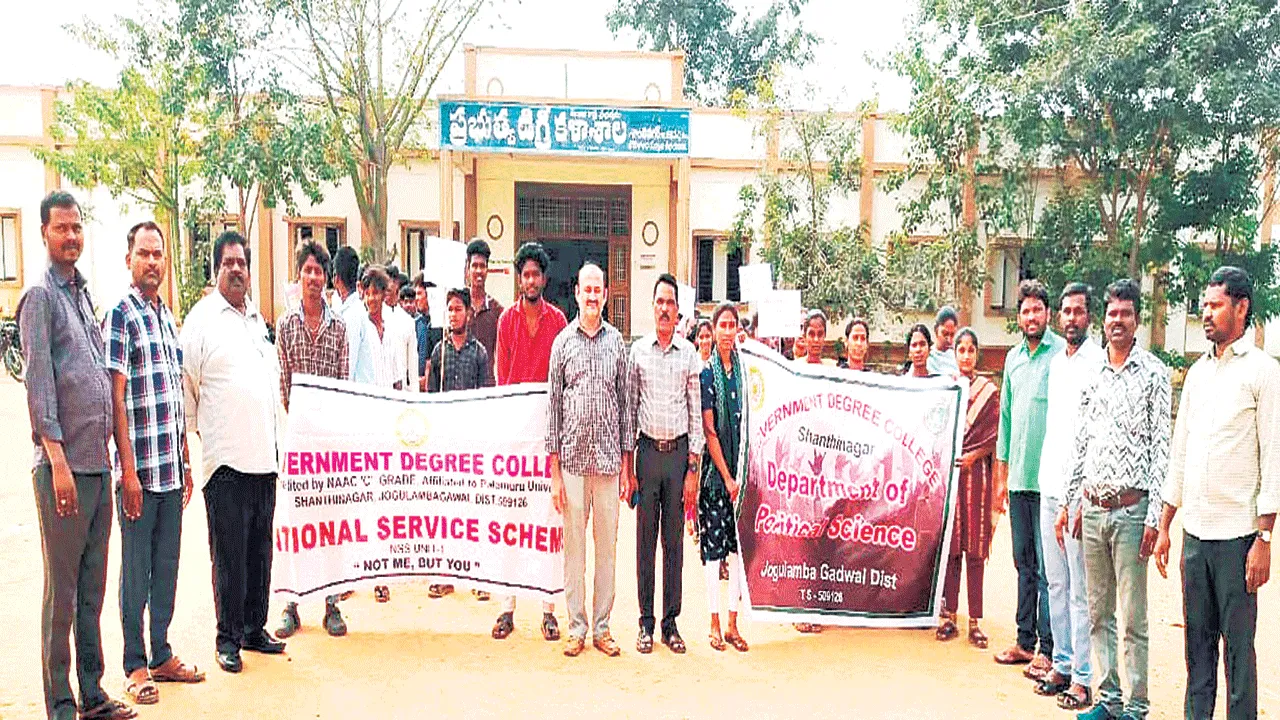 వడ్డేపల్లి, జనవరి 24 (ఆంధ్రజ్యోతి): భారత ప్రజాస్వామ్య వ్యవస్థలో రాజ్యాంగం పౌరులకు కల్పించిన ఓటుహక్కును ప్రతీ ఒక్కరు సద్విని యోగం చేసుకోవాలని ప్రిన్సిపాల్ డాక్టర్ రమా ఓబులేష్ అన్నారు. జాతీయ ఓటర్ల దినత్సోవం సందర్భంగా శనివారం శాంతినగర్లోని ప్రభు త్వ డిగ్రీ కళాశాల విద్యార్థులతో అవగాహన ర్యా లీ నిర్వహించారు. ఈసందర్భంగా ప్రిన్సిపాల్ అ ధ్యక్షతన, రాజనీతిశాస్త్రం డిపార్ట్మెంట్, ఎన్ఎస్ ఎస్ యూనిట్-1 ఆధ్వర్యంలో కళశాల విద్యార్థు ల చేత ఓటర్ల ప్రతిజ్ఞ చేయించారు. కార్యక్రమం లో వైస్ ప్రిన్సిపాల్ డాక్టర్ సంపత్కుమార్, డా క్టర్ ఏడుకొండలు, ఎన్ఎస్ఎస్ ప్రోగ్రాం ఆఫీసర్ రాఘవేందర్, జీవ జయరాజ్, చంద్రశేఖర్, అధ్యాపకేతర బృందం, విద్యార్థులు ఉన్నారు.