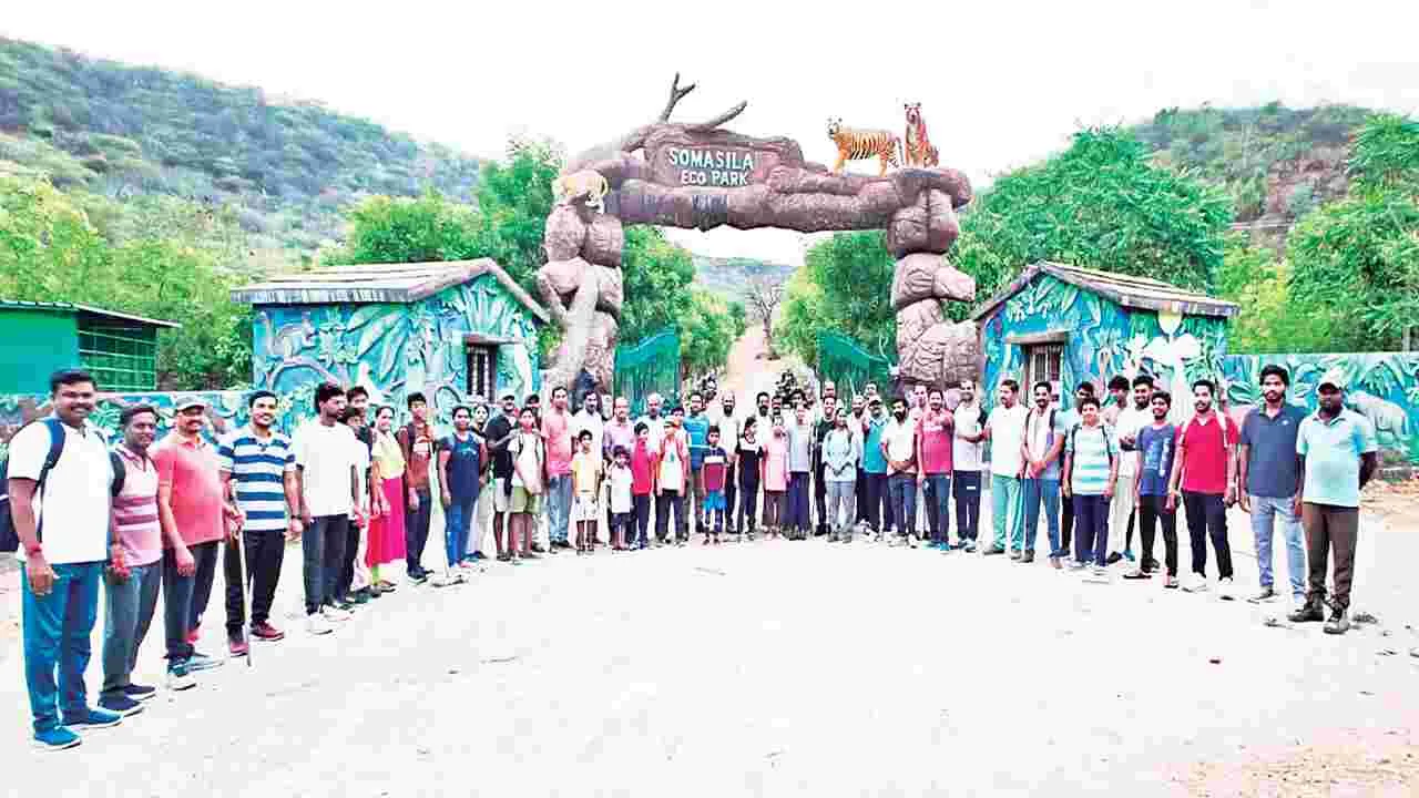 కొ ల్లాపూర్ మండల పరిధిలోని సోమశిల గ్రామ రహదారిలో ఉన్న ఎకో పార్కు ప్రకృతి సౌంద ర్యాన్ని ఆస్వాదిస్తూ, శారీరక దృఢత్వం కోసం శనివారం ఉదయం ప్రముఖ యోగా మాస్టర్ పతంజలి శంకర్ గౌడ్ ఆధ్వర్యంలో యోగా సాధకులు భారీ ట్రెక్కింగ్ నిర్వహించారు.