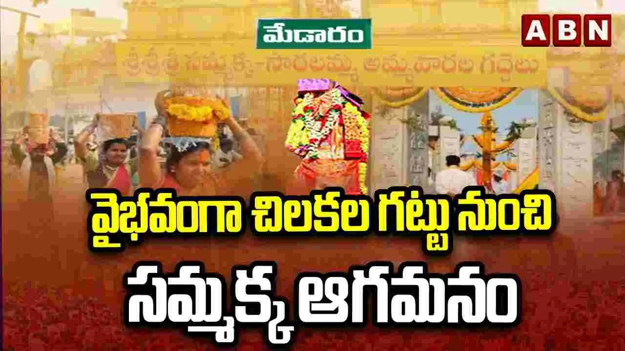 గుట్టపైకి కొంత దూరం వెళ్లాక ప్రధాన పూజారి మిగతా వారు ఆగిపోగా.. కృష్ణయ్య ఒక్కరే గుట్ట పైభాగాన తల్లి స్థావరం వద్దకు వెళ్లారు. అక్కడ సుమారు రెండు, మూడు గంటల పాటు ఆయన రహస్య పూజలు నిర్వహించారు. ఆ తర్వాత తల్లి రూపమైన కుంకుమ భరిణను తీసుకొని బయలుదేరారు. మార్గమధ్యలో వేచివున్న మిగతా పూజారులతో కలిసి కిందకు బయలుదేరారు. మంత్రులు సీతక్క, పొంగులేటి, అడ్లూరి లక్ష్మణ్, ములుగు కలెక్టర్ టీఎస్ దివాకర, ఎస్పీ సుధీర్ రామ్నాథ్ కేకన్తో పాటు వేలసంఖ్యలో భక్తులు ఎదురుచూస్తుండగా భరిణ రూపంలో ఉన్న సమక్కతో పూజారులు వచ్చారు. సమ్మక్కతల్లి రాకను పురస్కరించుకొని, ఆ తల్లికి గౌరవ సూచకంగా ములుగు ఎస్పీ సుధీర్ ఏకే 47తో గాల్లోకి నాలుగు రౌండ్లు పేల్చి వందనం సమర్పించారు. అనంతరం చిలుకల గుట్ట ప్రధాన ద్వారం వద్ద మరోదఫా మూడు రౌండ్లు గాల్లోకి పేల్చి తల్లి వస్తున్నట్టుగా భక్తులకు సంకేతాలు పంపారు. సమ్మక్కను పూజారులు మార్గమధ్యలో మేడారంలోని ఆమె గుడికి తీసుకువెళ్లారు. అక్కడ ఆదివాసీ సంప్రదాయం ప్రకారం ప్రత్యేక పూజలు చేశారు. ఆ తర్వాత సమ్మక్కను అక్కడి నుంచి తరలివస్తుండగా తల్లిని దర్శించుకునేందుకు దారి పొడవునా వేలాది మంది భక్తులు బారులు తీరి నిల్చున్నారు. పూజారులతో పాటు గద్దెల వరకు వెంటనడిచారు. సమ్మక్క రాక సందర్భంగా శివసత్తులు పూనకాలతో ఊగిపోయారు. తల్లి నామస్మరణతో ఆ ప్రాంతమంతా మార్మోగింది. పూజారులు తల్లిని గద్ద్దెపై ప్రతిష్టించే సమయంలో భక్తుల దర్శనాలను కొద్దిసేపు నిలిపివేశారు. కరెంట్ సరఫరాను కూడా బంద్ చేశారు. సమ్మక్కను గద్దెపై నిలిపిన తర్వాత పది నిముషాల పాటు రహస్య పూజలు నిర్వహించి వెనుదిరిగిన తర్వాత తల్లి దర్శనానికి అనుమతిచ్చారు.