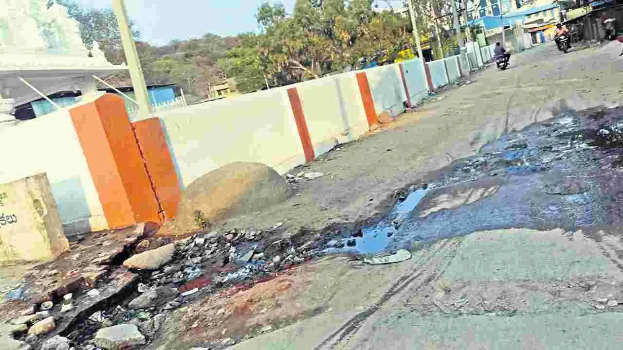 (ఆంధ్రజ్యోతి-యాదగిరిగుట్ట ) : పాతగుట్ట (యాదగిరిగుట్ట) దేవస్థానం సమీపంలో పారిశుధ్యం అస్తవ్యస్తంగా మారింది. ఆలయం వెనుక భాగం నుంచి వెలువడే చెత్తాచెదారంలో డ్రైనేజీ నిండిపోయి దుర్గఽంధం వెదజల్లుతోంది. కాగా, రోడ్లపైకి మురికి నీరు పారుతోంది. వీటికి తోడు పందులు గుంపులుగా తిరుగుతున్నాయి. దోమలు, ఈగలతో భక్తులు ఇబ్బందులు పడుతున్నారు. గత ఫిబ్రవరి మాసంలో జరిగిన స్వామివారి వార్షిక బ్రహ్మోత్సవాల నుంచి కొద్ది కొద్దిగా డ్రైనేజీ నిండిపోయినప్పటికీ శానిటేషన విభాగం ఇప్పటి వరకు స్పందించడం లేదు. ఆలయం పక్కన భక్తుల కోసం ప్రైవేట్ ఫంక్షన హాళ్లు, అద్దెగదులు ఉన్నాయి. ఇక్కడి నుంచి వ్యాపిస్తున్న దుర్వాసనతో పాతగుట్ట స్వయంభువులను దర్శించుకునేందుకు వచ్చే భక్తులు ముక్కు పుట్టలదిరి ఇబ్బందులు పడుతున్నారు. తక్షణమే సంబంధిత అధికారులు స్పందించి మురుగు నీటి దుర్వాసననను నిర్మూలించేందుకు చర్యలు చేపట్టాలని స్థానికులు కోరుతున్నారు.