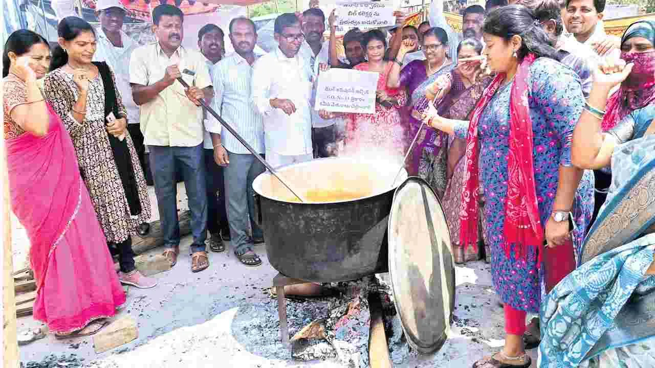 భానుపురి, ఏప్రిల్ 2 (ఆంధ్రజ్యోతి) : విద్యుత శాఖలో ఆర్టిజన్లకు సర్వీసు రూల్స్ అమలు చేయాలని టీవీఏసీ జేఏసీ ఉమ్మడి నల్లగొండ జిల్లా కోచైర్మన కొండ నకులుడు, సూర్యాపేట డివిజన చైర్మన గణే్షబాబు, కన్వీనర్ తిరుపతయ్య అన్నారు. గురువారం సూర్యాపేట జిల్లా కేంద్రంలోని జమ్మిగడ్డ విద్యుత సర్కిల్ కార్యాలయం వద్ద విద్యుత ఆర్టిజన్లు వంటా వార్పు నిర్వహించారు. ఈ సందర్భంగా పలువురు మాట్లాడారు. ఆర్టిజన్లకు ఉద్యోగ భద్రత కల్పించి సమాన పనికి సమాన వేతనం చెల్లించాలని కోరారు. వంట వార్పు కార్యక్రమానికి 1104, 327, టీఆర్వీకేఎస్, సీఐటీయూ, ఎస్సీ,ఎస్టీ,బీసీ ఓసీఇంజనీర్స్ అసోసియేషన, పవర్ డిప్లమా అసోసియేషన్స మద్దతు తెలిపాయి. కార్యక్రమంలో నాయకులు ఉడుముల నర్సింహాచారి, పబ్బు మల్లయ్య నాగమణి, దీప్తి, శ్రీధర్రెడ్డి, కార్మికులు పాల్గొన్నారు.
