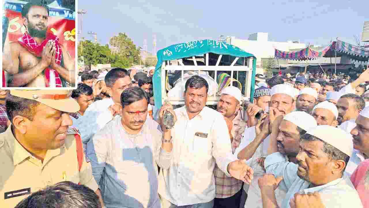 అంతిమయాత్రలో ప్రభుత్వ విప్ బీర్ల అయిలయ్య, తెలంగాణ సాంస్కృతిక సారఽథి చైర్మన గుమ్మడి వెన్నెల