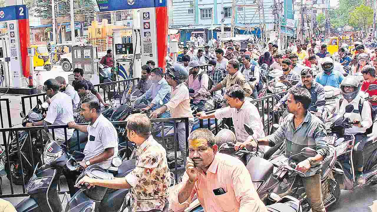 ఇంధన సంస్థలకు ముందస్తుగా ఇండెంట్ పెట్టి నగదు చెల్లించినప్పటికీ సకాలంలో ట్యాంకర్లను పంపడం లేదని, నగదు చెల్లించాక ట్యాంకర్ రావడానికి నాలుగు రోజులపైనే సమయం పడుతుందని పెట్రోల్ బంకుల డీలర్లు వాపోతున్నారు. ఇది ఏ ఒకరికో.. ఇద్దరికో ఎదురైన సమస్య కాదు.. దాదాపు రాష్ట్ర వ్యాప్తంగా ఇదే పరిస్థితి నెలకొంది. దీంతో రాష్ట్రంలోని వందలాది పెట్రోల్ బంకుల్లో ఆదివారం రాత్రి నుంచి నో స్టాక్ బోర్డులు వెలిశాయి. ఆయిల్ కంపెనీల నిర్వాకంతో రాష్ట్రవ్యాప్తంగా వాహనదారులు అష్టకష్టాలు పడ్డారు. సోమవారం ఉదయం నుంచే పెట్రోల్, డీజిల్ కోసం పడరాని పాట్లు పడ్డారు. పెట్రోలు బంకులకు వాహనాలు పోటెత్తడంతో.. చీమల పుట్టలను తలపించాయి. మండుటెండ ను సైతం లెక్కచేయకుండా ద్విచక్ర వాహన చోదకులు గంటల తరబడి క్యూలైన్లలో ఉన్నారు. ఒకవైపు రాష్ట్రంలో భారీగా పెట్రోల్, డీజిల్ నిల్వలు ఉన్నాయని పౌరసరఫరాలశాఖ బులిటెన్లు విడుదల చేస్తోంది. సాధారణ రోజులతో పోలిస్తే రెట్టింపు స్థాయిలో ఇంధన సరఫరా చేస్తున్నట్లు లెక్కలు చెబుతున్నా... క్షేత్రస్థాయి పరిస్థితులు మాత్రం అందుకు భిన్నంగా ఉన్నాయి. ప్రైవేటు బంకులే కాదు.. పౌరసరఫరాలశాఖ, పోలీస్ శాఖ, జైళ్ల శాఖ ఆధ్వర్యంలో ఏర్పాటు చేసిన బంకుల్లోనూ పెట్రోల్, డీజిల్ నిల్వలు పూర్తిగా ఖాళీ అయ్యాయి.