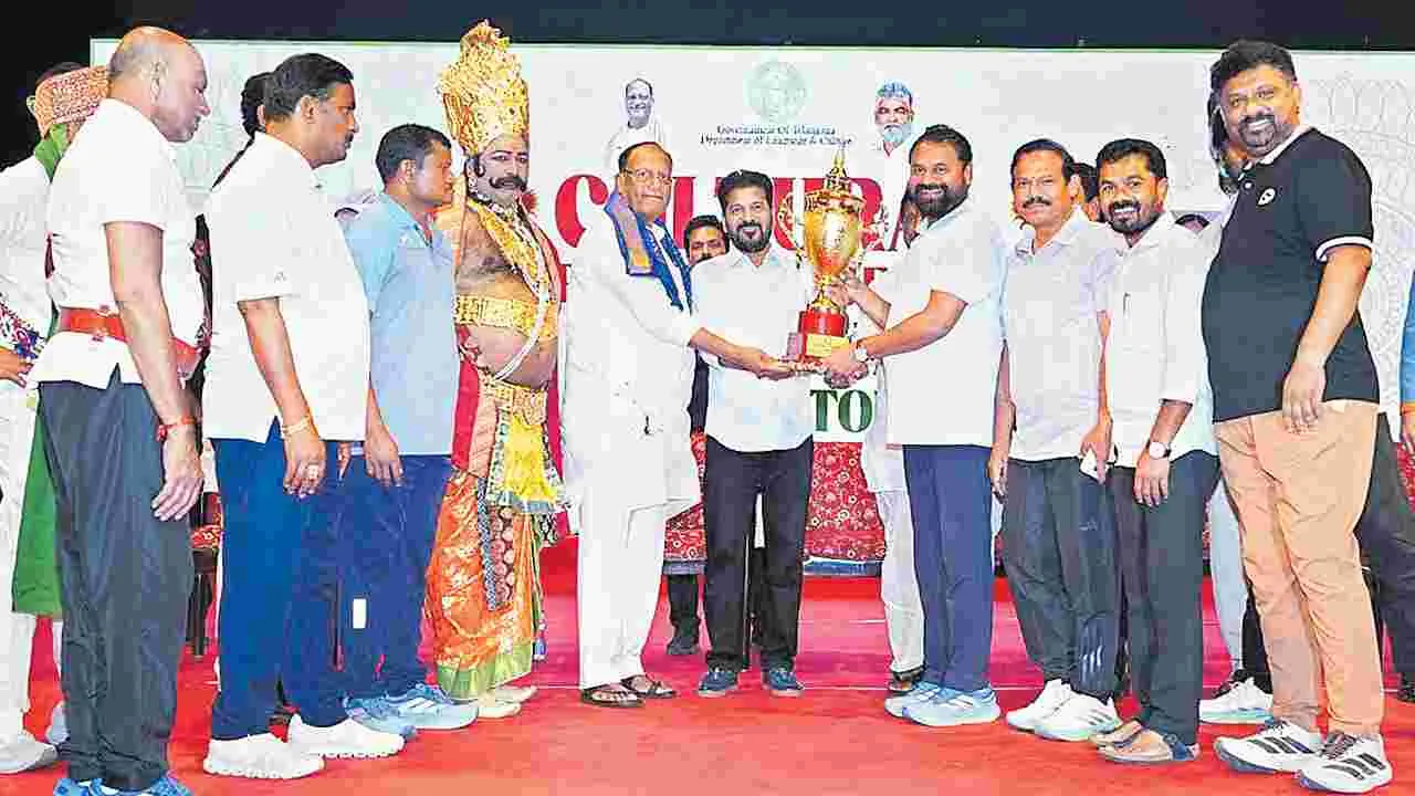 హైదరాబాద్/రవీంద్రభారతి, మార్చి 29(ఆంధ్రజ్యోతి): తెలంగాణలోని విద్యార్థులు చదువులోనే కాదు క్రీడల్లో రాణించినా వారికి ఉజ్వల భవిష్యత్తు ఇవ్వడానికి ప్రభుత్వం సిద్ధంగా ఉందని ముఖ్యమంత్రి రేవంత్ రెడ్డి తెలిపారు. నూతన క్రీడా విధానం తీసుకొస్తున్నామని, అటు ఆటలు, ఇటు చదువుతో పాటు సాంస్కృతిక కార్యక్రమాల్లో యువత చురుగ్గా ఉండాలని కోరుకుంటున్నామని చెప్పారు. ఈ క్రమంలోనే గచ్చిబౌలి స్టేడియంను అంతర్జాతీయ స్థాయి స్టేడియంగా మార్చడానికి రూ.700 నుంచి రూ.800 కోట్లతో ప్రణాళికలు రూపొందిస్తున్నామని తెలిపారు. దాని ప్రకారం గ్రామస్థాయి నుంచి పట్టణ స్థాయి వరకు సీఎం కప్ పేరిట క్రీడా పోటీలు నిర్వహించి, మెరికల్లాంటి వారిని గుర్తించి, శిక్షణ ఇచ్చి జాతీయ, అంతర్జాతీయ పోటీలకు పంపుతామని చెప్పారు. ఆదివారం రవీంద్ర భారతిలో ప్రజాప్రతినిధుల సాంస్కృతిక కార్యక్రమాల ముగింపు సభలో సీఎం మాట్లాడారు. క్రీడల్లో రాణించిన వారికి నగదు బహుమతులతో పాటు ఉద్యోగాలు ఇస్తున్నామని, నికత్ జరీన్, సిరాజుద్దీన్ దీనికి ఉదాహరణగా ఆయన పేర్కొన్నారు. వాస్తవానికి గ్రూప్ వన్ ఉద్యోగానికి కావాల్సిన డిగ్రీ విద్యార్హత సిరాజుద్దీన్కు లేక పోయినా ప్రత్యేక అనుమతితో ఆయనను డీఎస్పీని చేశామని సీఎం గుర్తుచేశారు. ఇటీవల విద్యార్థుల ప్రవర్తన, పోలీసులు నమోదు చేస్తున్న కేసులను పరిశీలిస్తుంటే కొంతమంది విద్యార్థులు చెడు వ్యసనాల బారిన పడుతున్నారని స్పష్టమవతుందన్నారు.