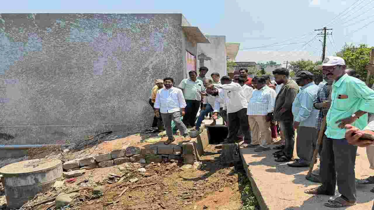 26వ డివిజన్లో డ్రైనేజీని పరిశీ లిస్తున్న మేయర్ ధర్ని మధుకర్