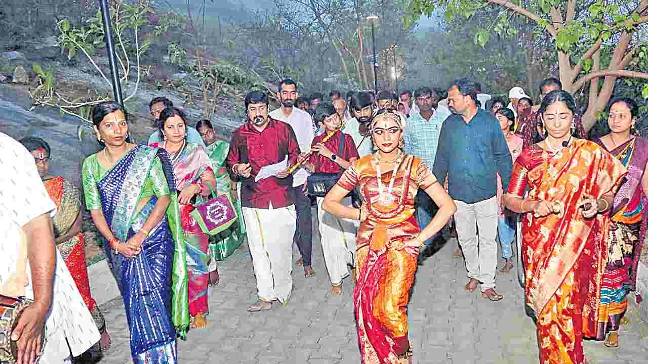 యాదగిరిగుట్ట/హైదరాబాద్ సిటీ, మార్చి 8(ఆంధ్రజ్యోతి): యాదగిరిగుట్ట లక్ష్మీనరసింహ స్వామి ఆలయంలో స్వామివారి జన్మనక్షత్రం స్వాతిని పురస్కరించుకుని ఆదివారం సామూహిక గిరిప్రదక్షిణ నిర్వహించారు. గిరి ప్రదక్షిణలో హైదరాబాద్కు చెందిన 12 ఏళ్ల బాలిక శ్రీవైష్ణోదేవి కూచిపూడి నృత్య భంగిమలను ప్రదర్శించి భక్తులను అలరించింది. మరోవైపు దివ్యక్షేత్రంలో ఉదయం 10 వరకు దట్టమైన పొగమంచు కమ్మేసింది. ఆదివారం సుమారు 40వేల మంది భక్తులు తరలిరాగా, ప్రత్యేక దర్శనానికి గంట, ధర్మదర్శనానికి 2గంటల సమయం పట్టింది. ఆలయ ఖజానాకు వివిధ విభాగాల ద్వారా రూ.45,46,811 ఆదాయం సమకూరింది.