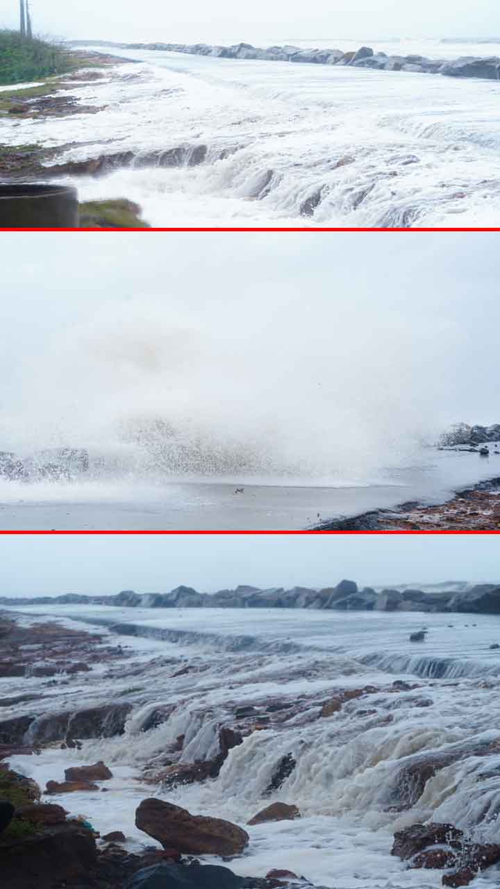 కాకినాడ జిల్లా ఉప్పాడ తుఫానుకు సముద్రపు అలలు రాళ్ల ఢీకొని రోడ్లపైకి ఎగసిపడుతున్న దృశ్యాలు.