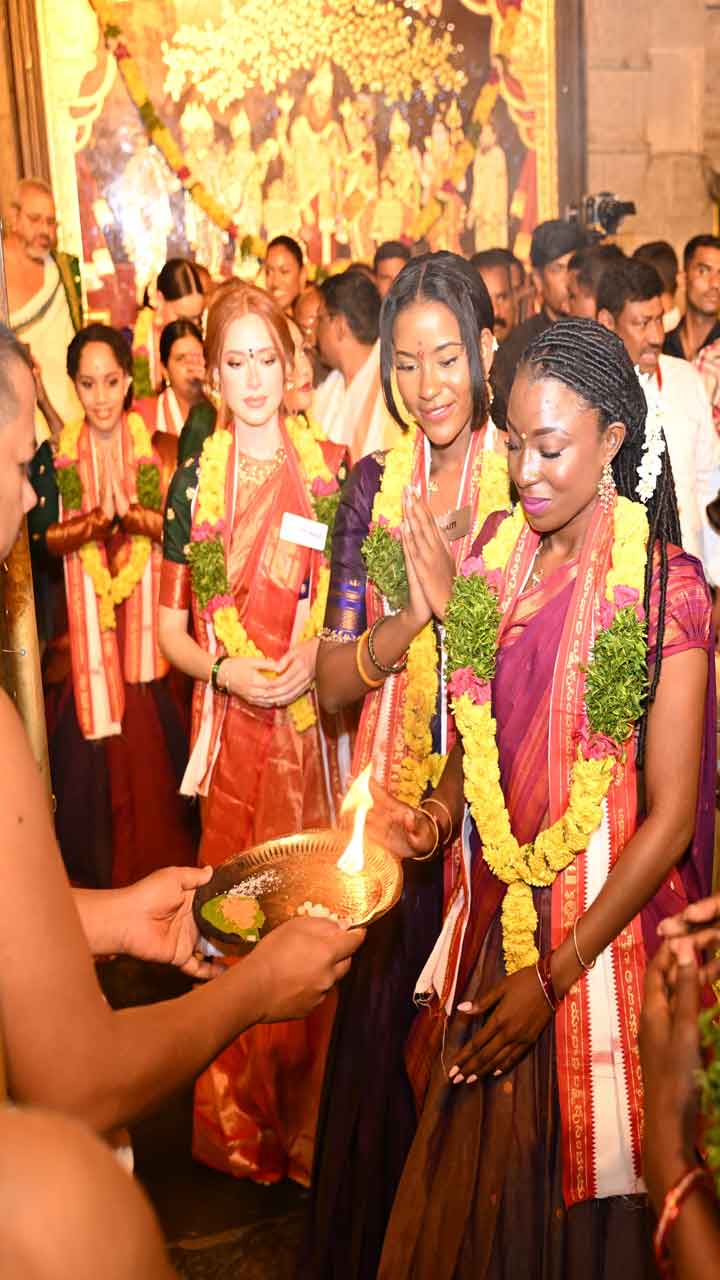 సుందరీమణులకు కండువా ప్రదానం చేసిన ఆలయ అర్చకులు''