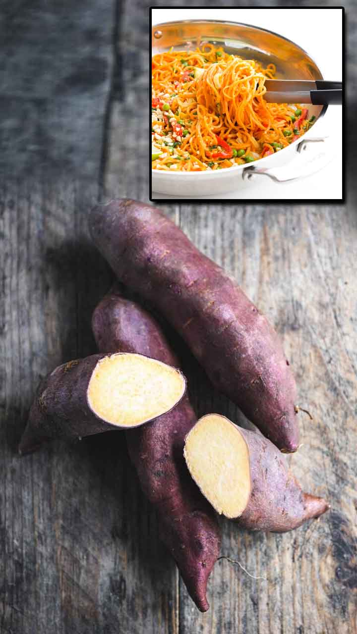 ముందుగా చిలగడదుంపలను శుభ్రంగా కడిగి పొట్టు తీసి, స్పైరలైజర్తో నూడుల్స్ మాదిరిగా కట్ చేసుకోవాలి.