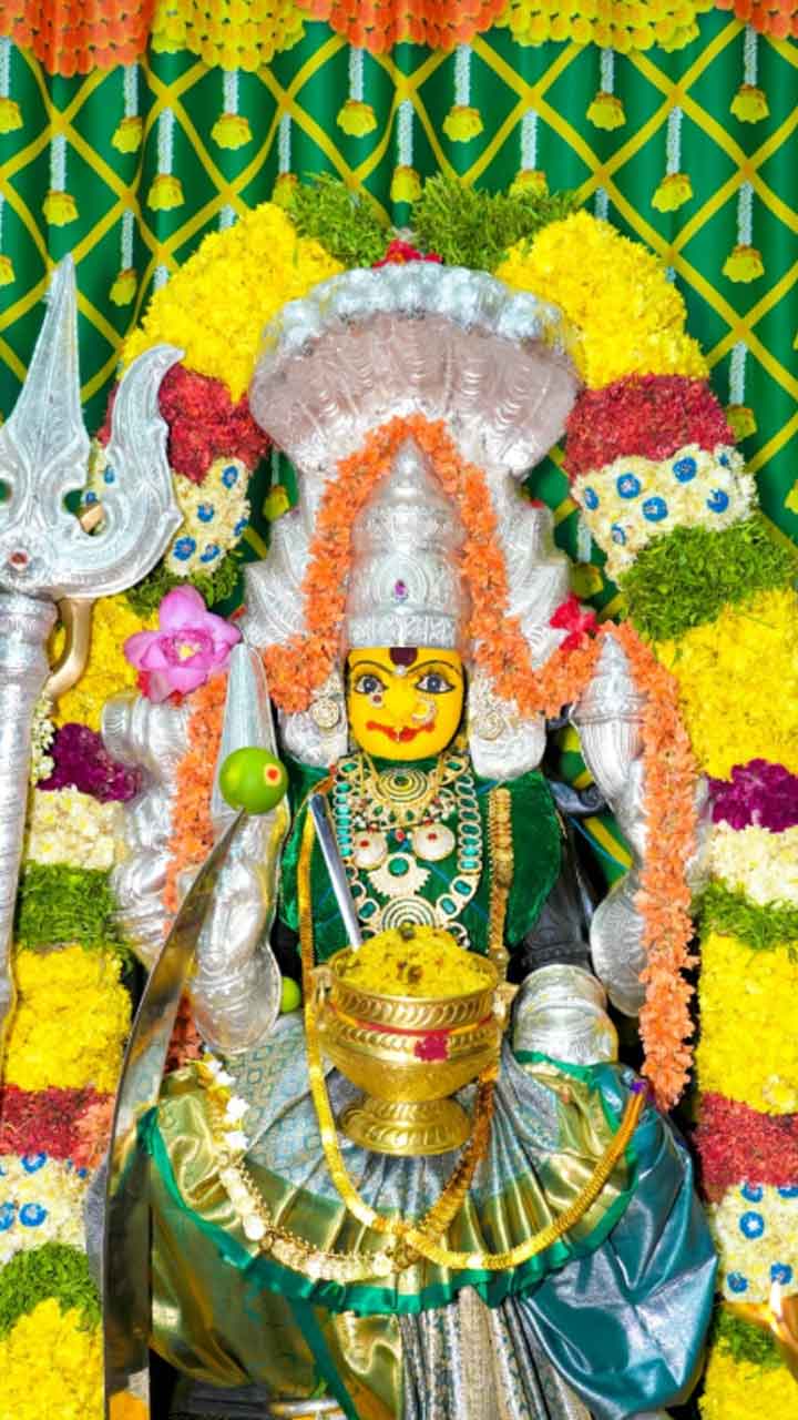 అమ్మవారిని పసుపు లేదా గంధం రంగు చీరతో అలంకరిస్తారు.